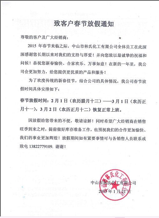 林德漆2015年春节前后发货安排