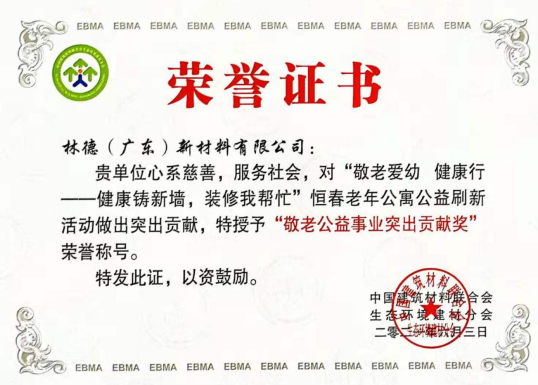 为了表彰林德漆所做的贡献,北京朝阳区养老协会秦利国会长和恒春养老集团陈利有董事长共同为林德漆颁发了锦旗,活动发起方生态建材分会冀志江教授和中国建材研究总院颜碧兰副院长为林德漆颁发了荣誉证书。